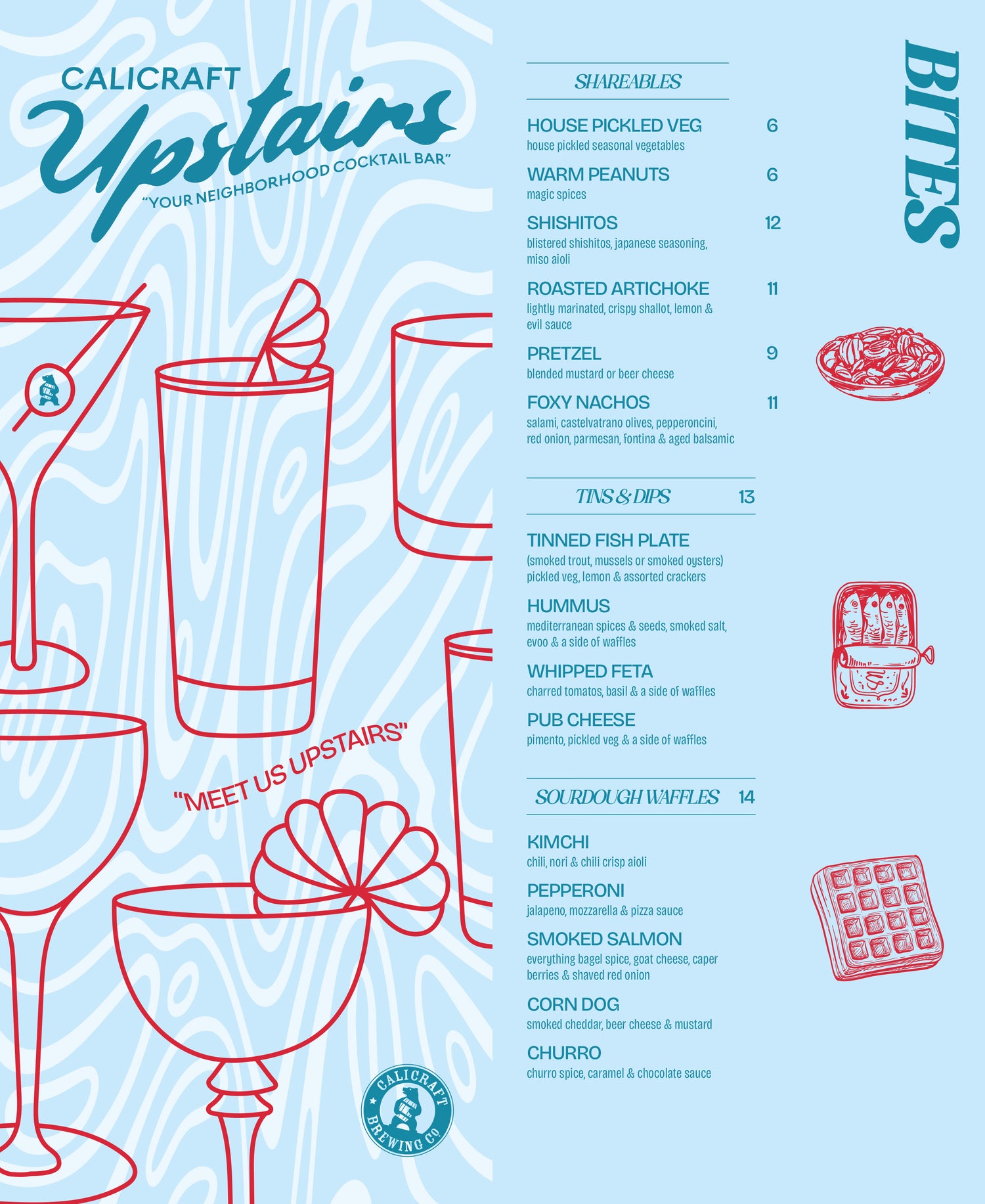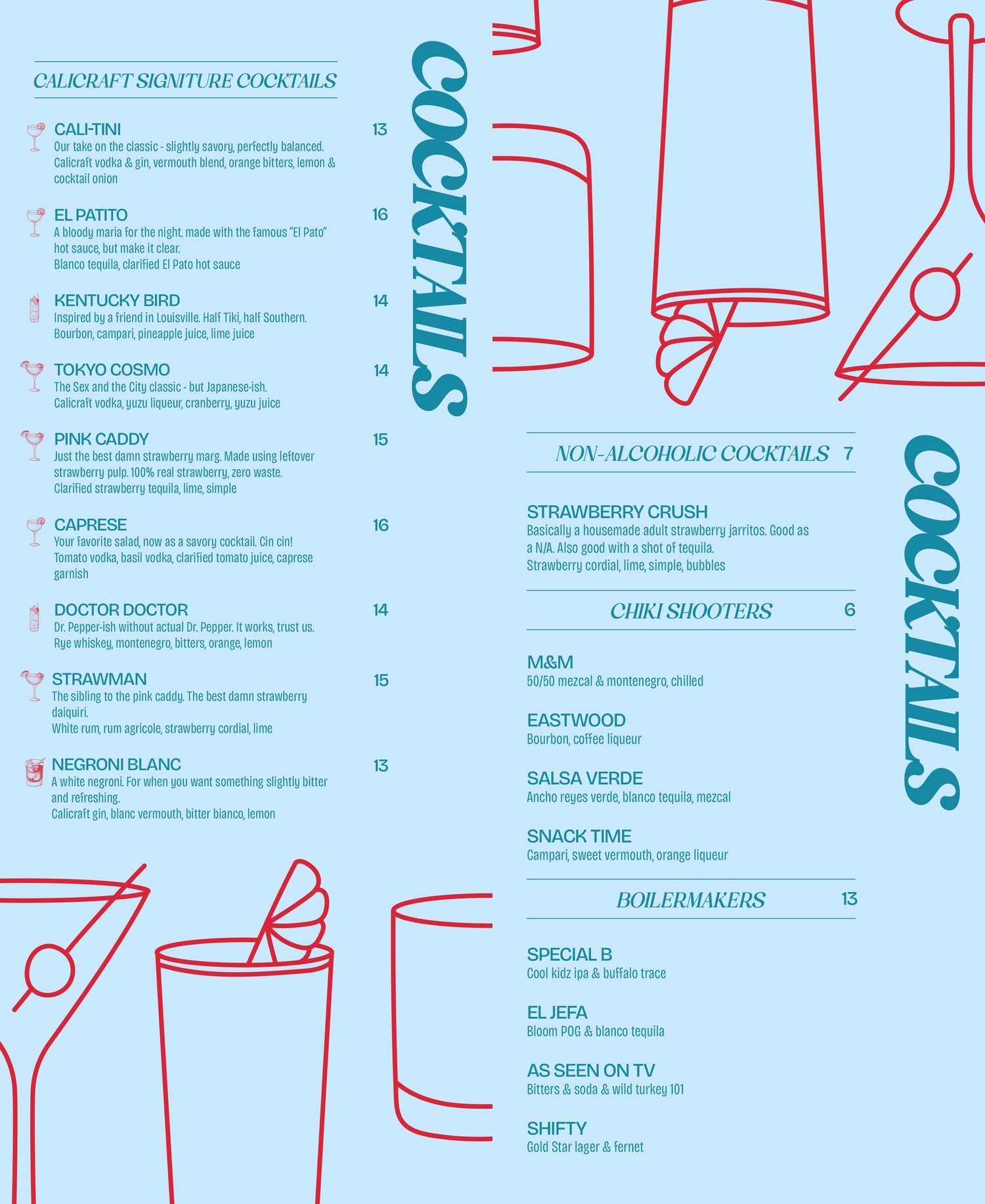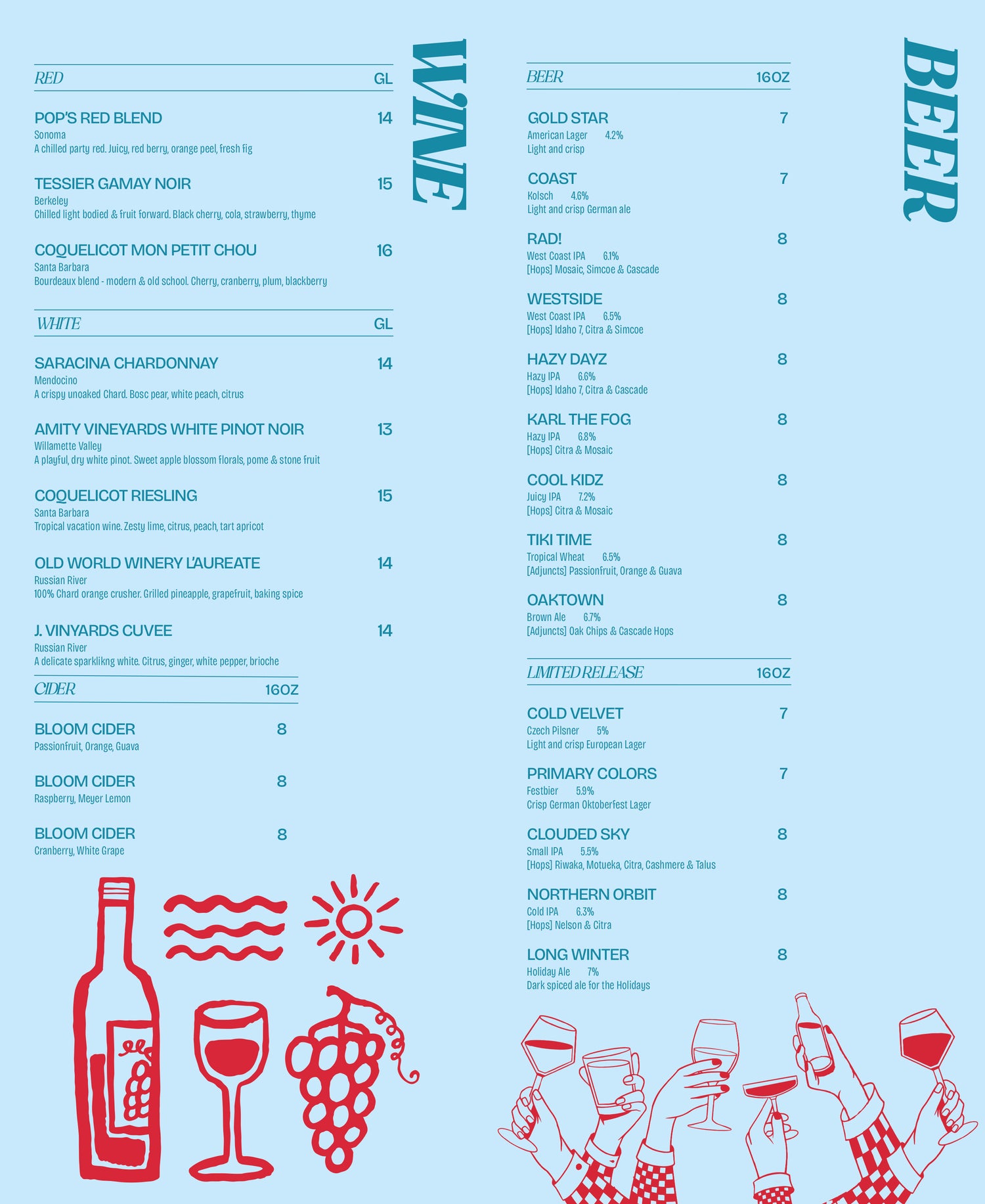 In addition to our handmade cocktails, and food menu, we will have 20 taps of classic Calicraft Beer and Limited Releases, and a wine menu featuring both traditional and natural wine from California.